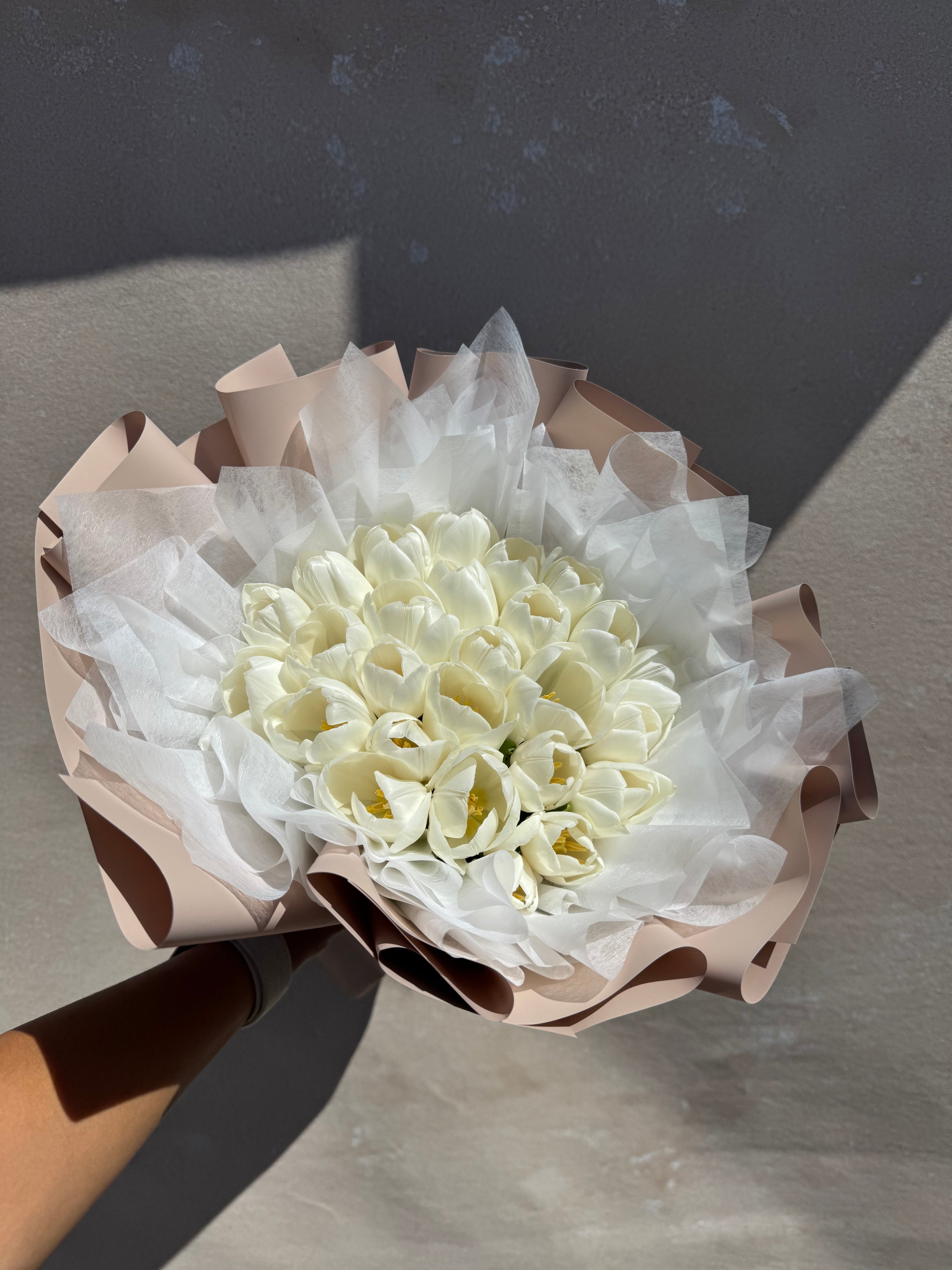 A rounded bouquet of Tulips. Color selection of tulips will vary based on current availability.