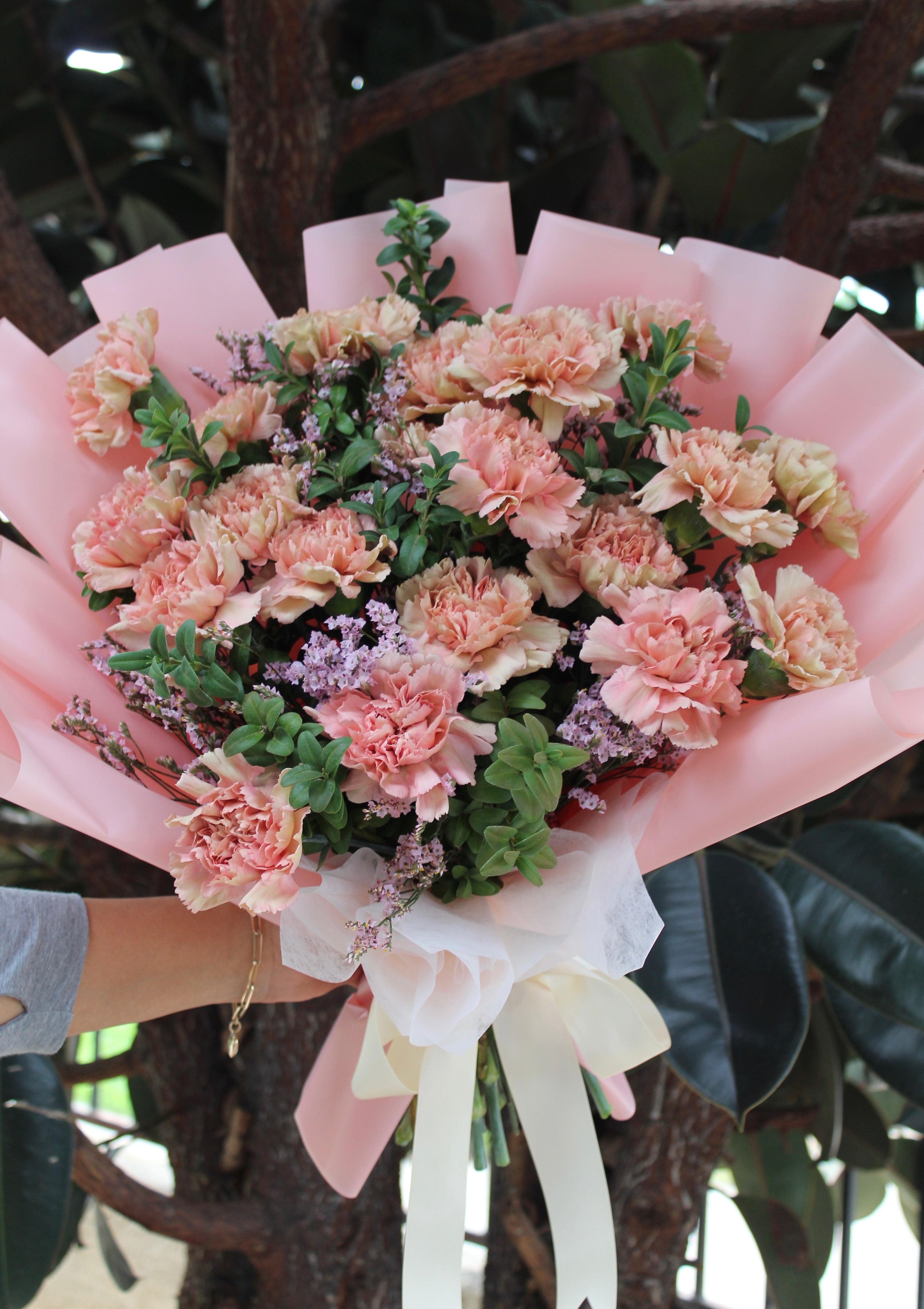 The Full of Carnations bouquet features an array of fresh carnations along with seasonal filler flower and greenery, making it the perfect gift for any occasion. Carnations are known for their long-lasting blooms providing a beautiful addition to any room or celebration.