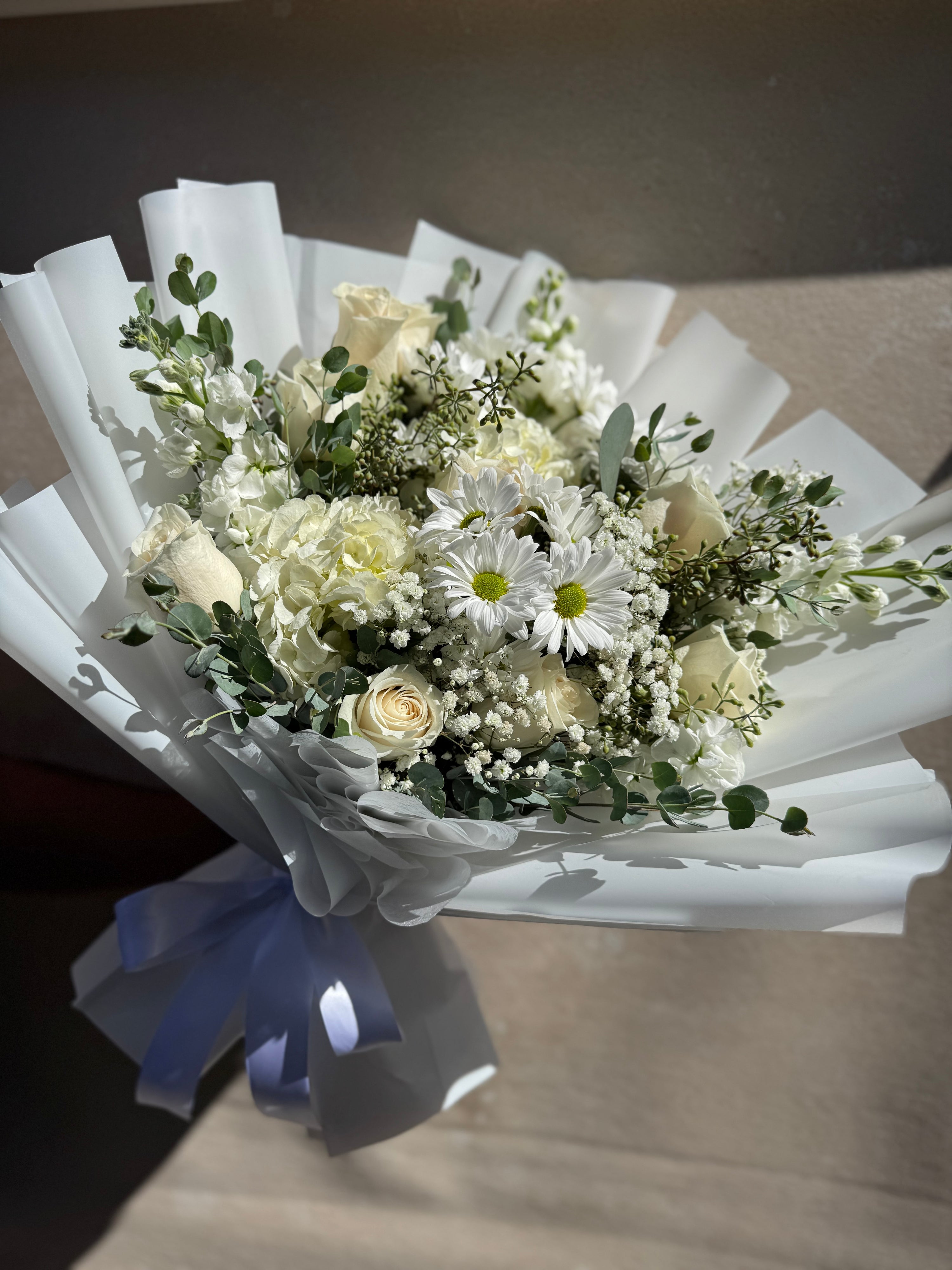 A monochromatic arrangement featuring an array of stunning white blooms with greenery.