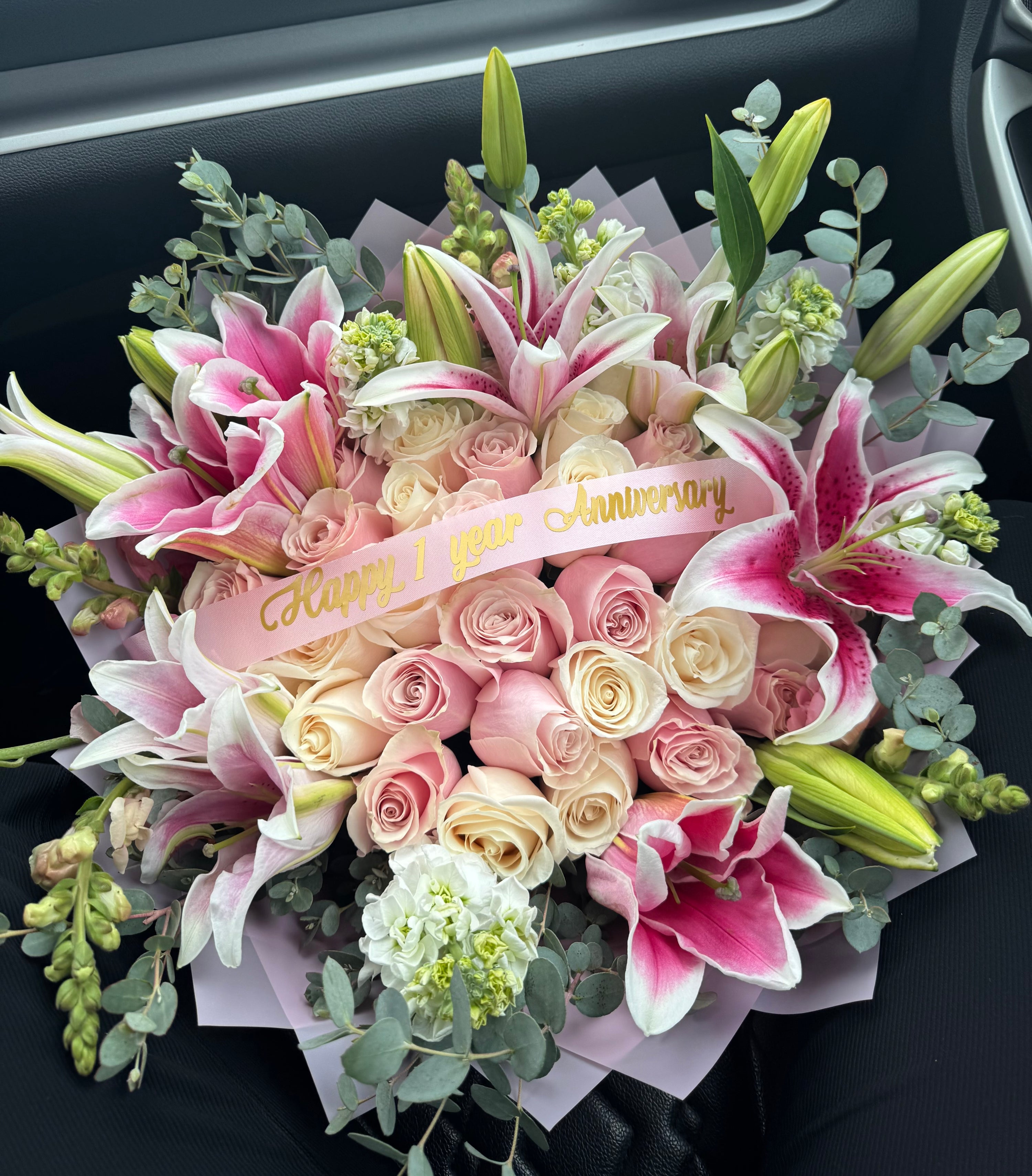 A stunning bouquet of roses, bloomed lilies, stock, snap dragons, and greenery.