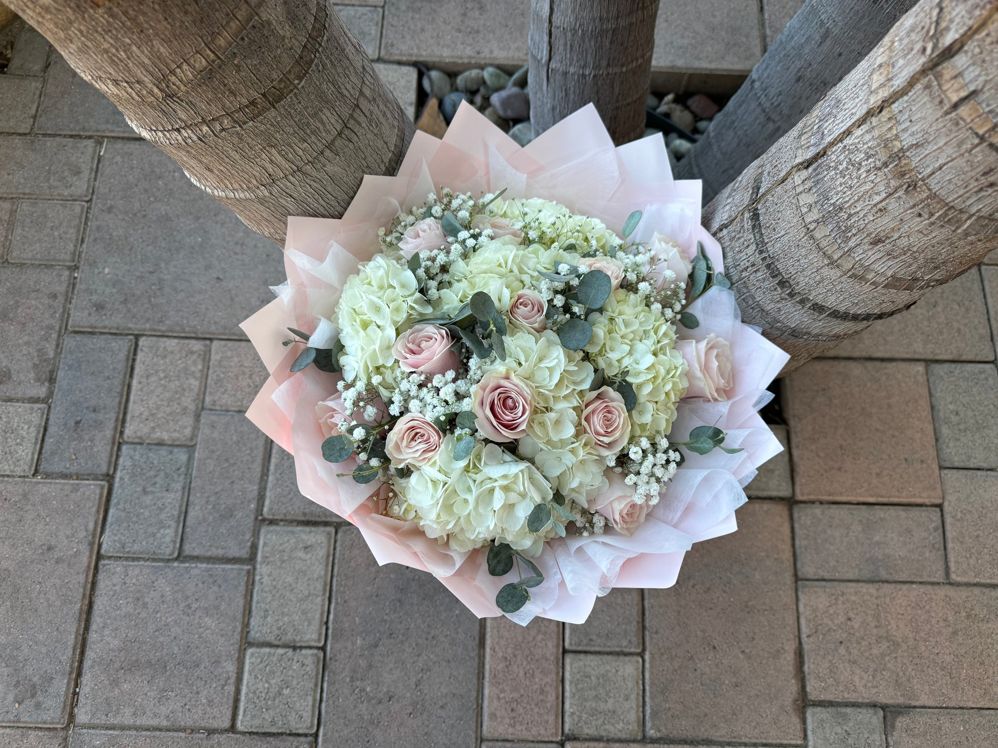 Gift them this beautiful arrangement consisting of white hydrangeas, pink roses, babies breath and greenery.